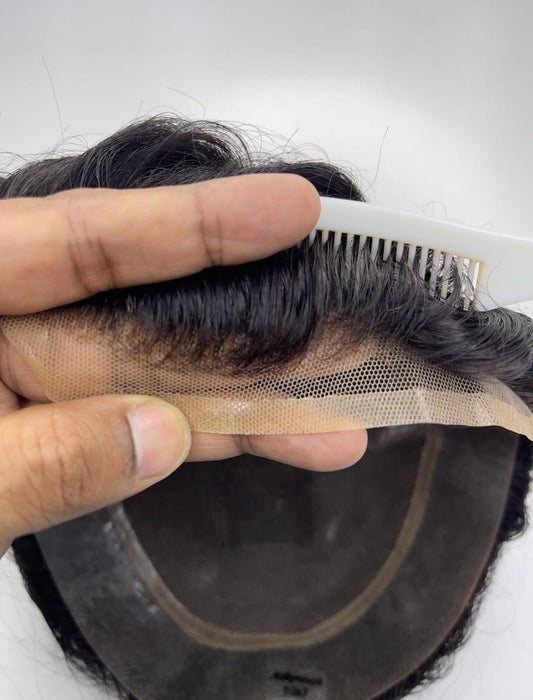 Gentlemen X Q6 French Lace with PU Sides human hair toupee Men's Toupee 1B Natural AM